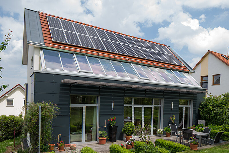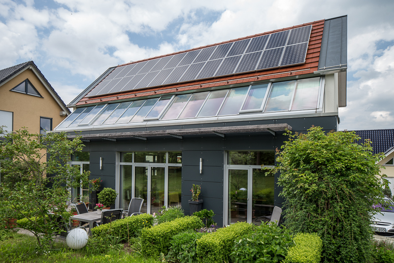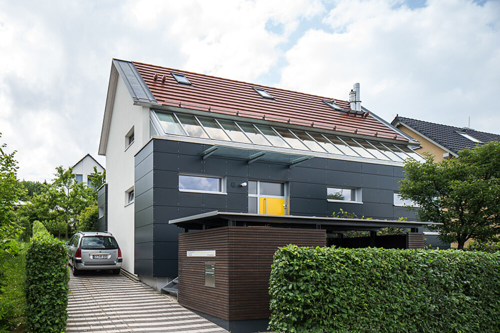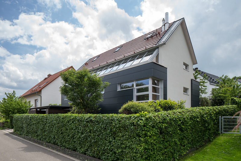 Im Ergebnis entstand ein Wohngebäude in Form eines lang und schmal wirkenden Baukörpers. Eine kontrastreiche Farb- und Materialwahl unterstreicht die gewünschte Wirkung. Der mittlere Teil des Gebäudes hebt sich mit seinen weißen Putzflächen von den mit anthrazitfarbenen Trespaplatten- verkleideten Flächen ab. Die nach Norden orientierte Seite mit den dahinterliegenden Erschließungsflächen und Nebenräumen weist einen nur geringen Anteil an Fensteröffnungen auf. Alle nach Süden orientierten Wohnräume sind durch eine großzügige Verglasung gekennzeichnet.