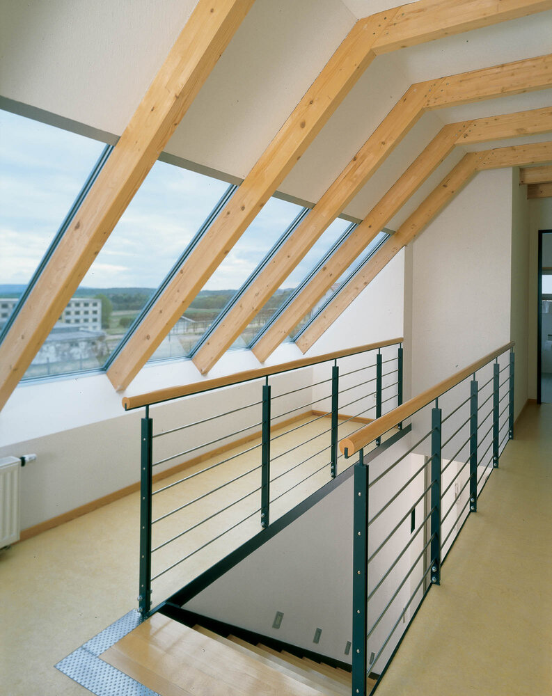 Den Mittelpunkt des Hauses bildet im Erdgeschoss ein großzügiger Essplatz mit anschließender offener Küche und zentraler Kochstelle. Eine Schiebetür ist das verbindende und trennende Element zwischen Wohn- und Essbereich. Im Dachgeschoss befinden sich die Spielzimmer der Kinder sowie das Schlafzimmer der Eltern und ein Bad. Der Spielflur kann mit einem zusätzlichen Arbeitsplatz kombiniert werden. Die Dachverglasung gewährleistet eine optimale Belichtung. Bei guter Fernsicht ist der Blick über das Thüringer Becken bis zum Kyffhäuser möglich.